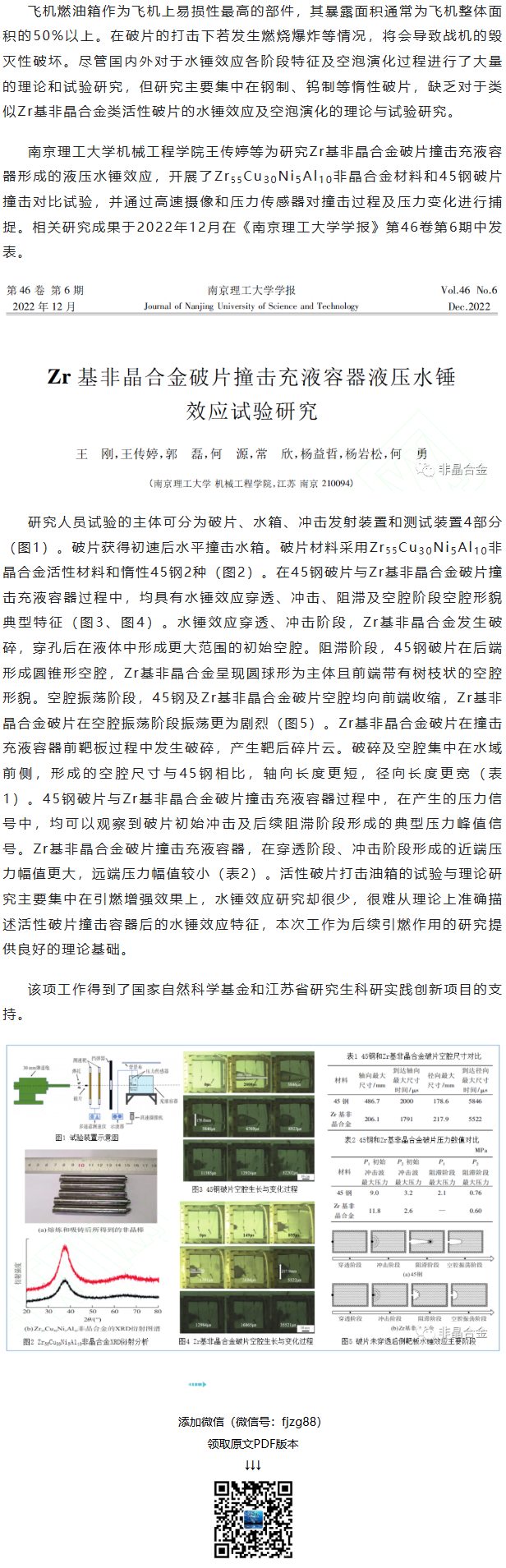 《南京理工大学学报》王传婷等工作:Zr基非晶合金破片撞击充液容器液压水锤效应试验研究