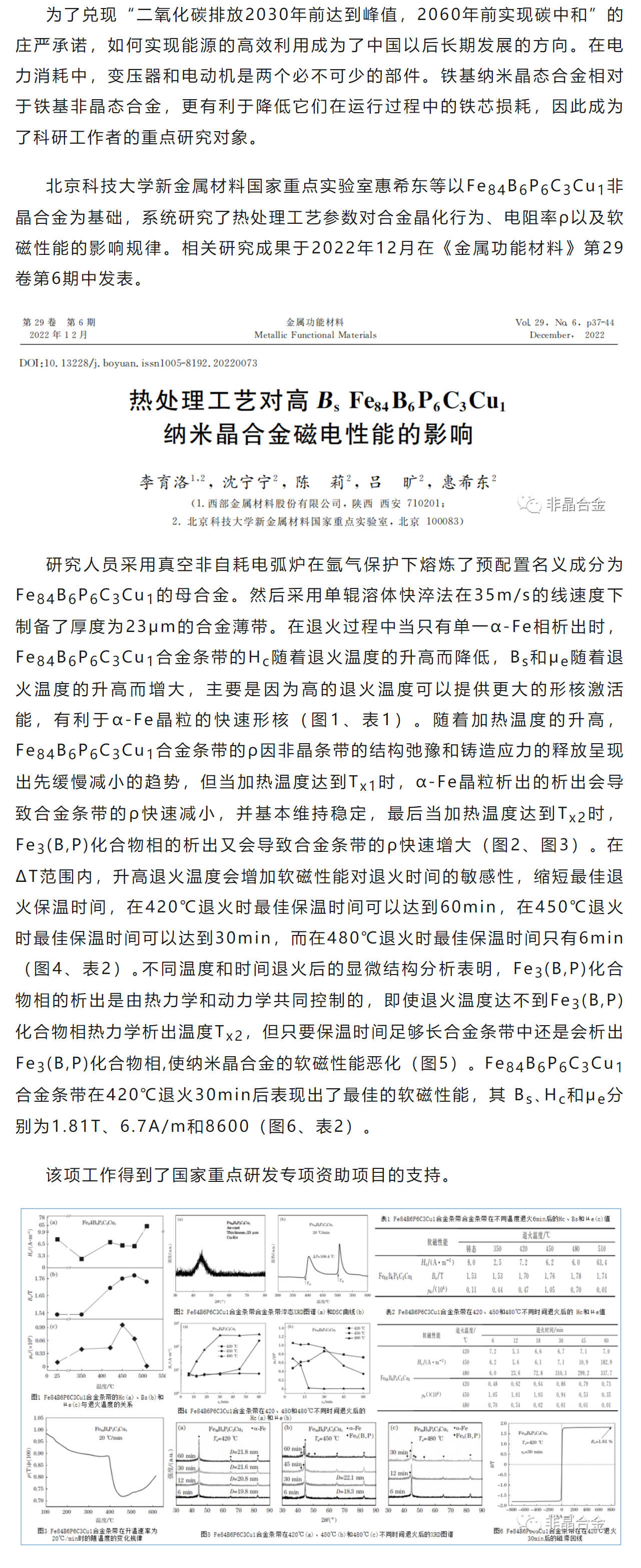 《金属功能材料》惠希东等工作:热处理工艺对高BsFe84B6P6C3Cu1纳米晶合金磁电性能的影响