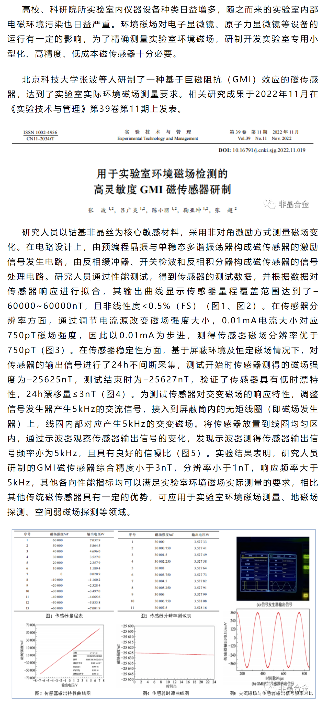 《实验技术与管理》张波等工作:用于实验室环境磁场检测的高灵敏度GMI磁传感器研制