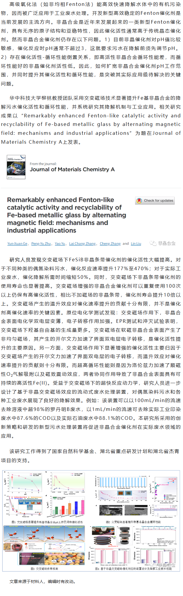 《J MATER CHEM A》柳林、张诚等工作:交变磁场显著提升非晶合金催化降解污水性能与循环性能