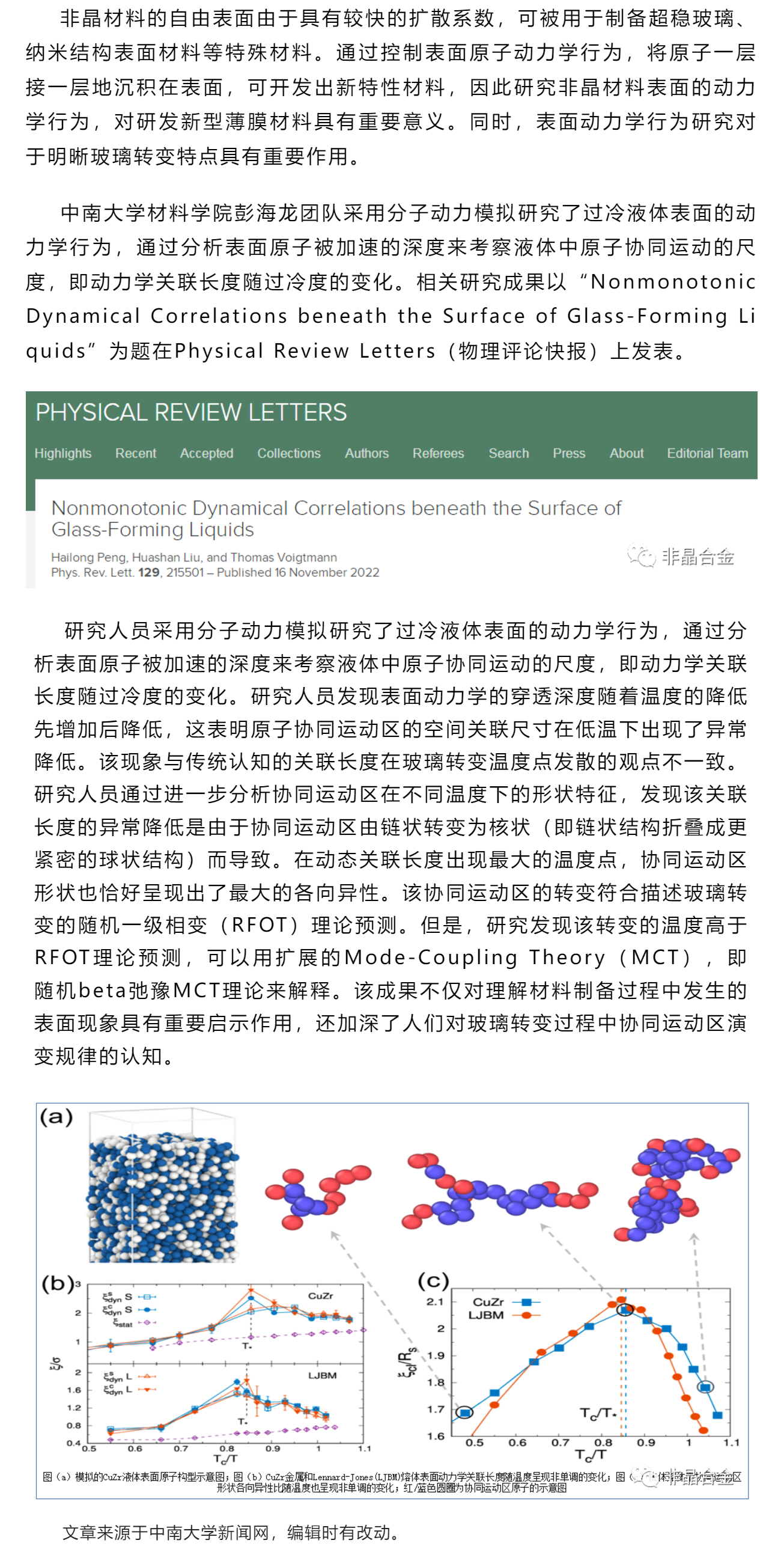 《Physical Review Letters》彭海龙等工作:过冷液体表面非单调动力学关联长度