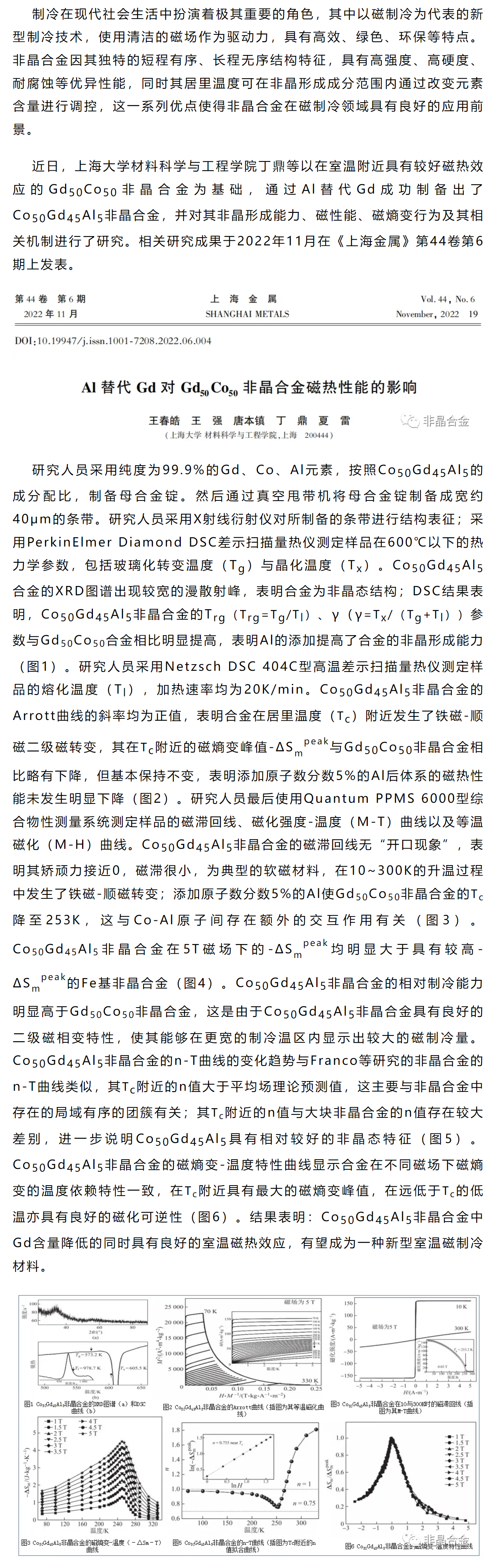 《上海金属》丁鼎等工作:Al替代Gd对Gd50Co50非晶合金磁热性能的影响