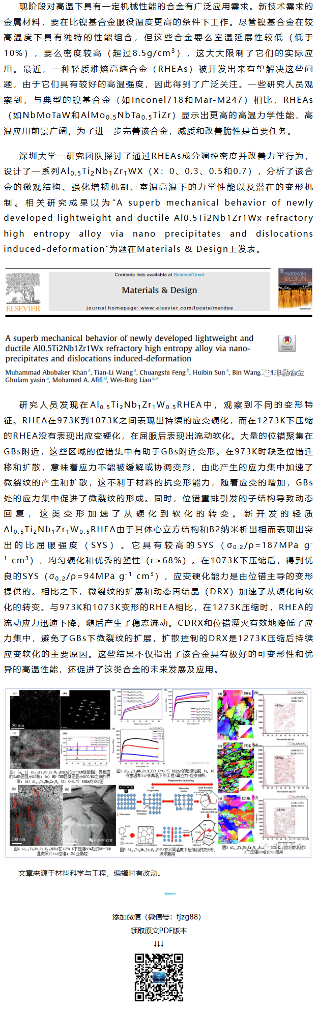 《Mater Des》深圳大学一研究团队工作:一种新型优异力学性能的轻质难熔高熵合金