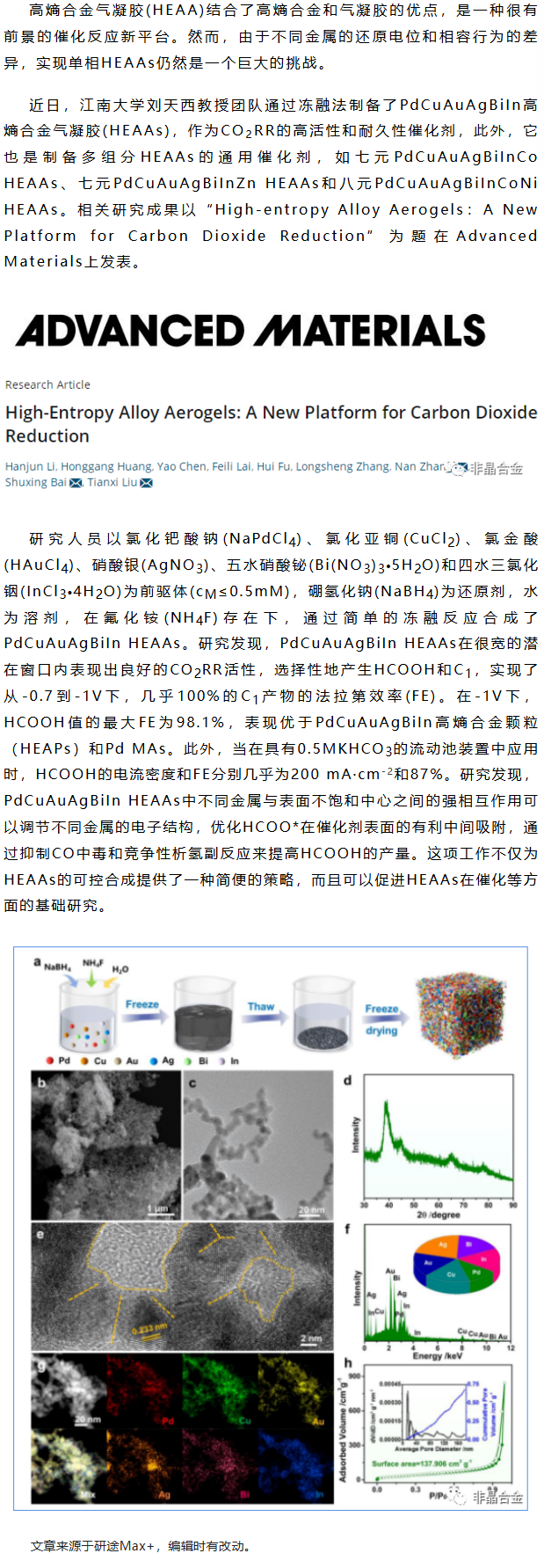 《Advanced Materials》刘天西等工作:高熵合金气凝胶助力CO2还原
