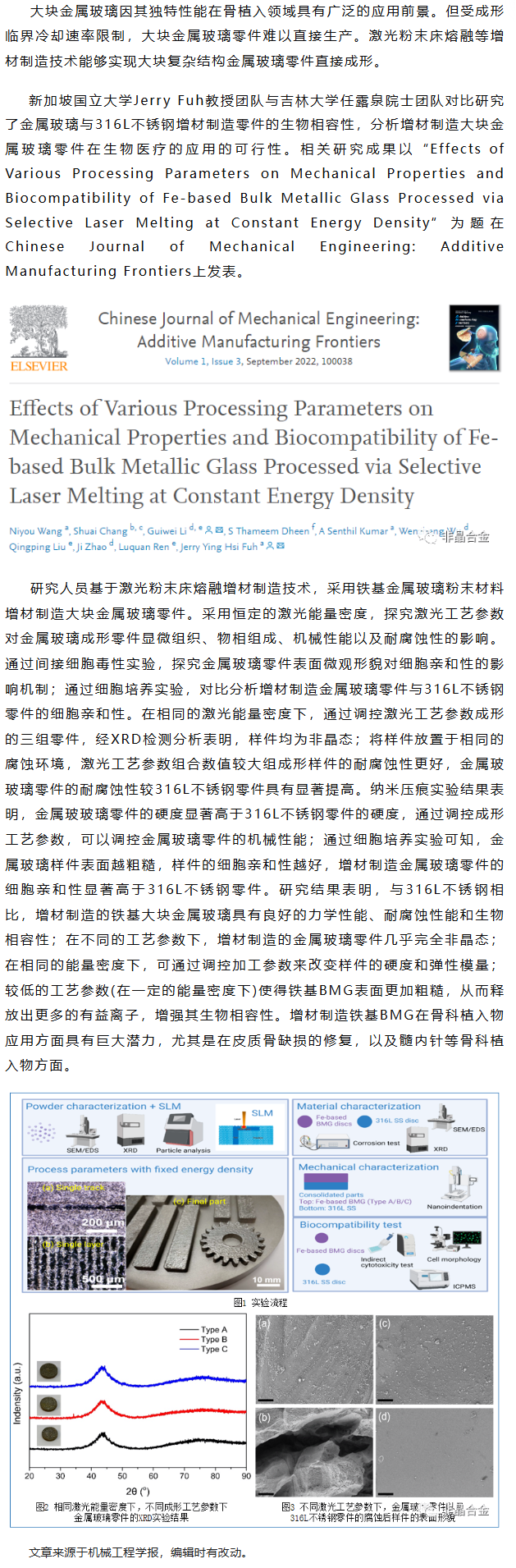 《CJME:AMF》任露泉院士团队等工作:SLM成形金属玻璃力学性能和生物相容性的研究