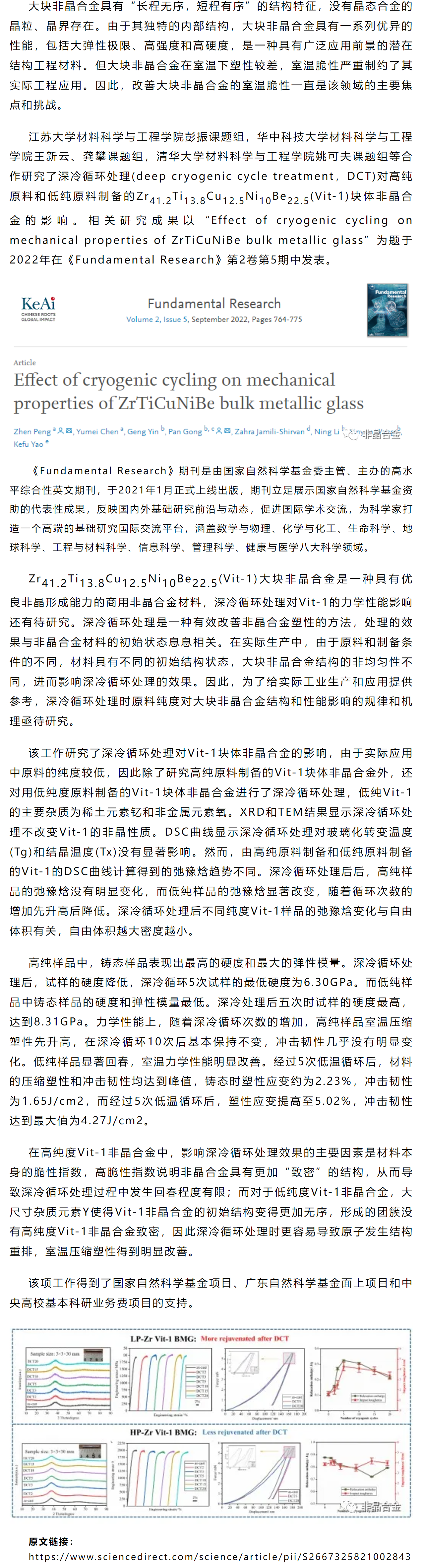 《Fundamental Research》彭振、龚攀等工作:低温循环对ZrTiCuNiBe大块非晶合金力学性能的影响