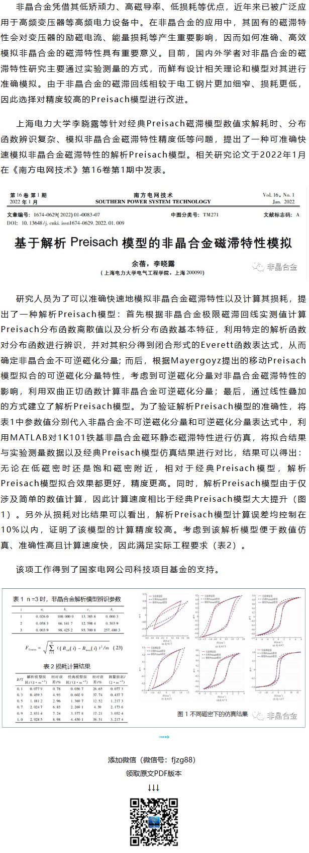 《南方电网技术》李晓露等工作:基于解析Preisach模型的非晶合金磁滞特性模拟
