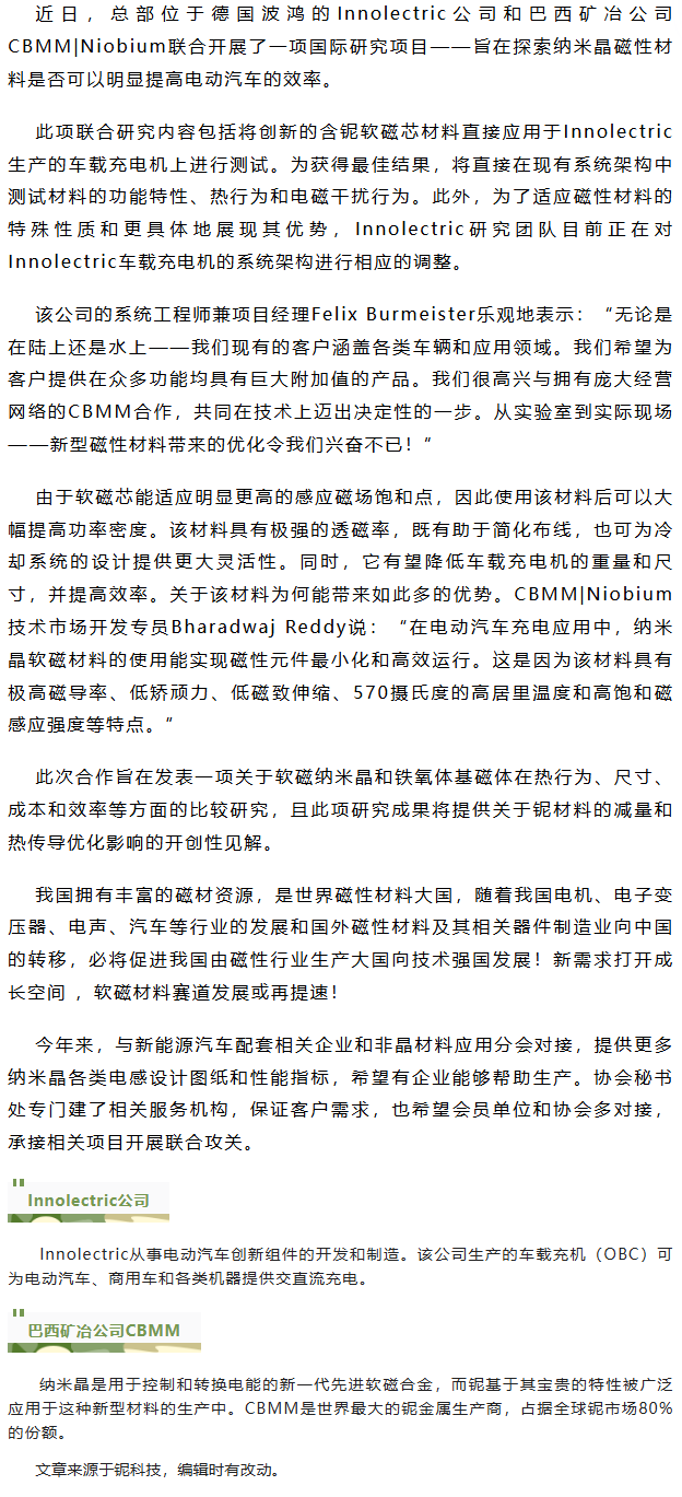 探索纳米晶磁性材料如何提高电动汽车的效率,德国Innolectric和巴西矿冶公司CBMM联合开展研究项目