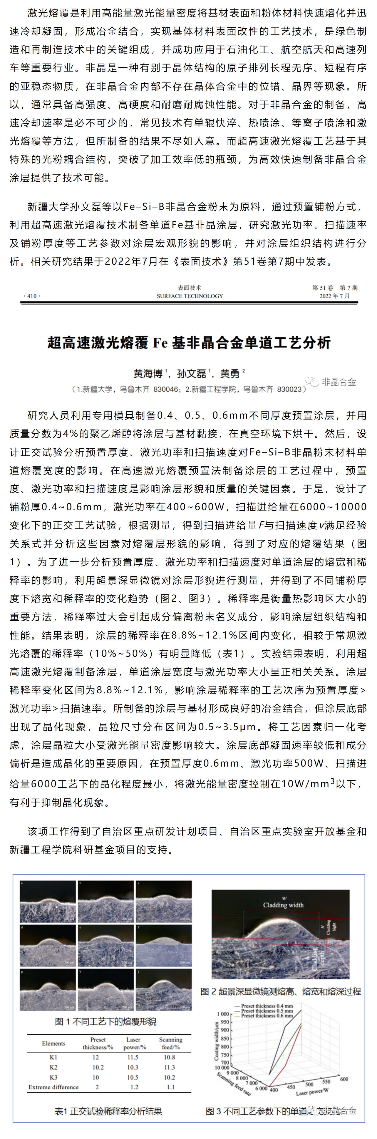 《表面技术》孙文磊等工作:超高速激光熔覆Fe基非晶合金单道工艺分析