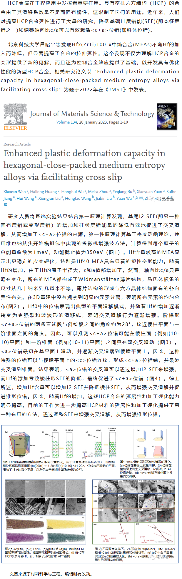《JMST》吕昭平等工作:交滑移提升中熵合金塑性变形能力