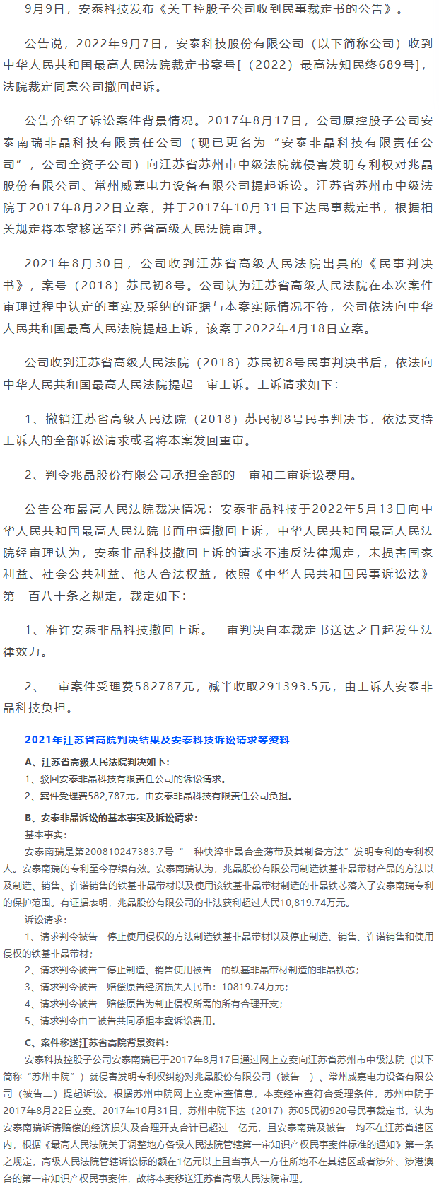 最高人民法院裁定:准许安泰非晶科技撤回上诉