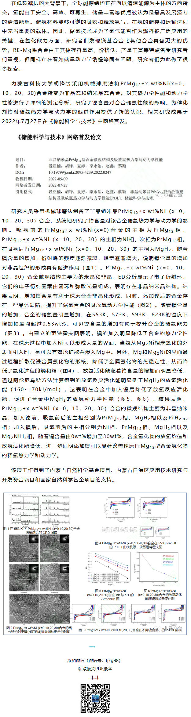 《储能科学与技术》胡锋等工作:非晶纳米晶PrMg12型合金微观结构及吸放氢热力学与动力学性能