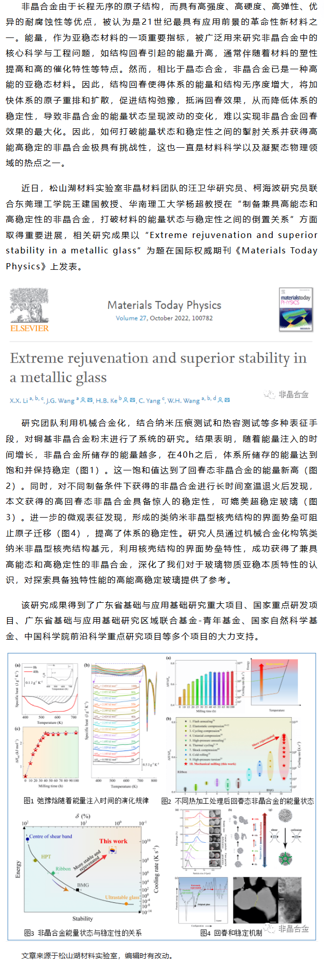 Mater.Today Phys. 汪卫华等工作:高能态高稳定非晶合金的制备取得重要进展
