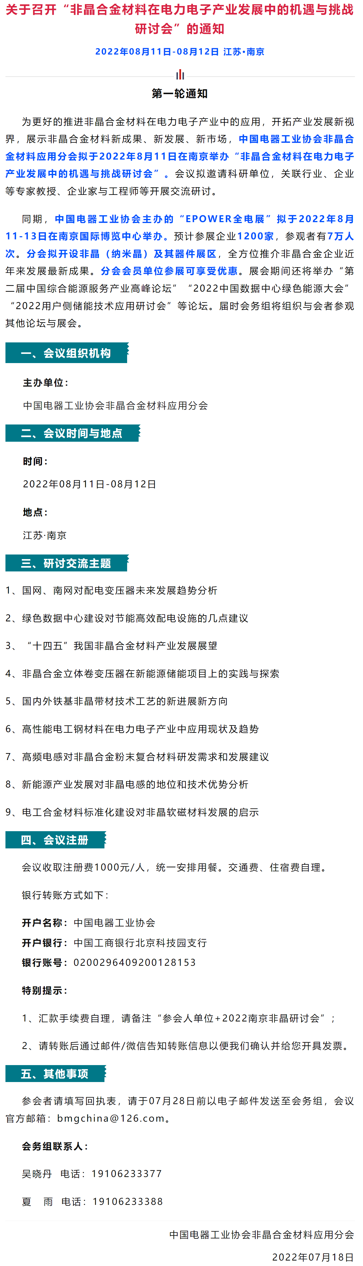 会议通知 | 非晶合金材料在电力电子产业发展中的机遇与挑战研讨会(第一轮)