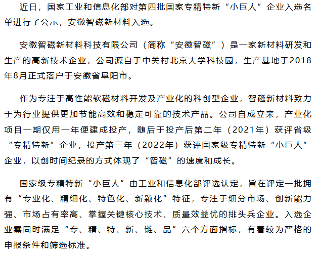 做纳米晶仅三年!安徽智磁新材料获评国家级专精特新“小巨人”