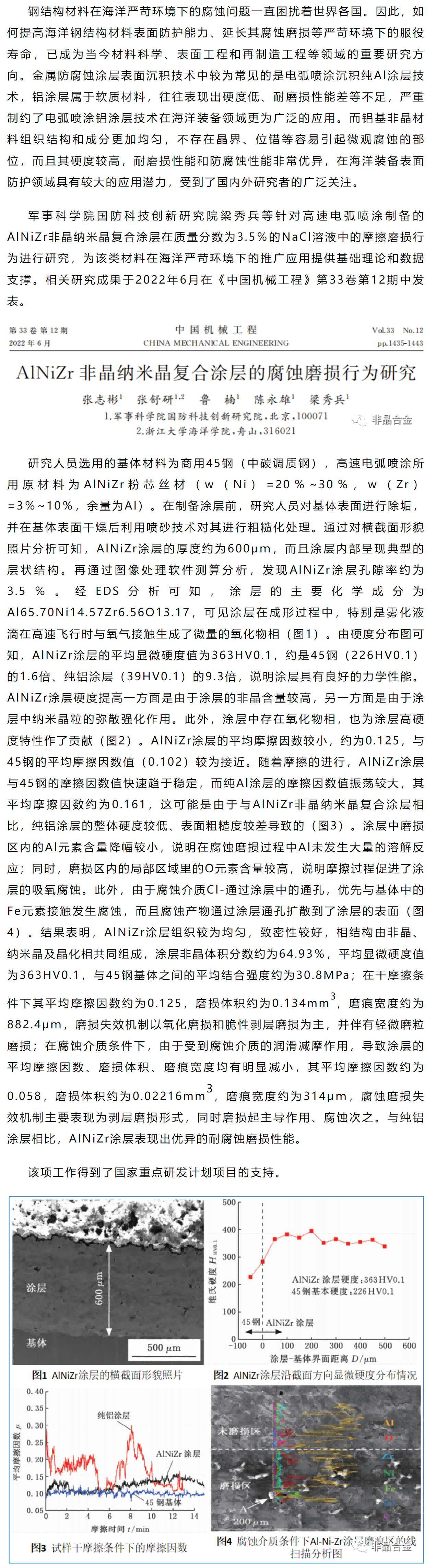 《中国机械工程》梁秀兵等工作:AlNiZr非晶纳米晶复合涂层的腐蚀磨损行为研究